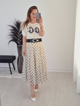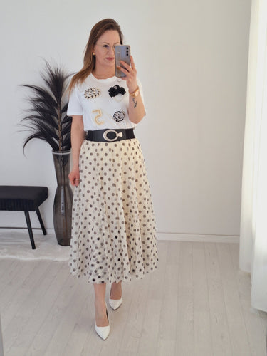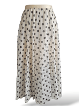 Cette élégante jupe en tulle crème à pois gris et taille élastique allie sophistication féminine et touche moderne et est parfaite pour des looks polyvalents.