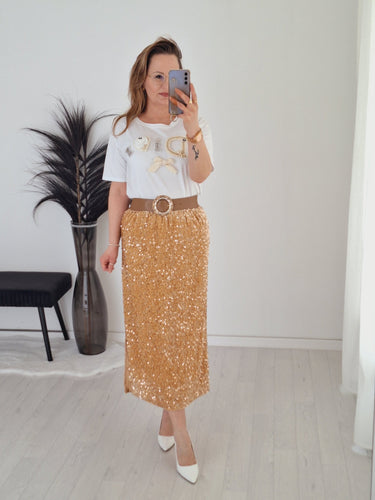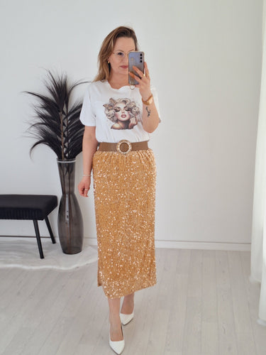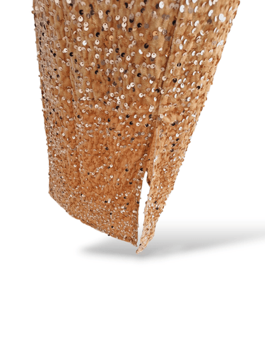 Cette élégante jupe en velours doré apporte une touche glamour à votre tenue avec ses sequins scintillants et son tissu doux et fluide. Parfaite pour les occasions spéciales ou les looks élégants de tous les jours, la jupe allie confort et élégance féminine dans un design trapèze classique.